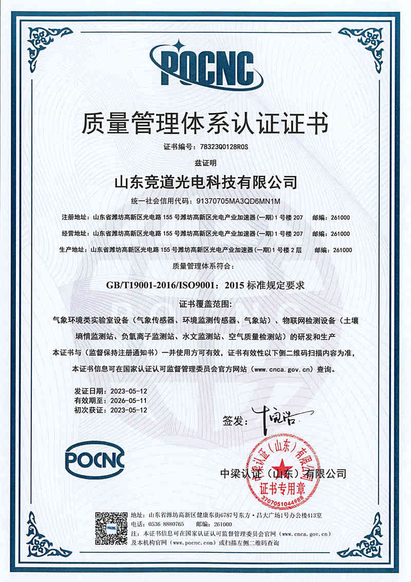 山東競(jìng)道光電科技有限公司是一家致力于氣象環(huán)境監(jiān)測(cè)系統(tǒng)的研發(fā)、生產(chǎn)、銷(xiāo)售、服務(wù)于一體的企業(yè),公司總部位于山東省濰坊市。目前,公司已具備批量生產(chǎn)系列化的自動(dòng)氣象與環(huán)境監(jiān)測(cè)站、各類(lèi)探測(cè)傳感器、及維護(hù)保障設(shè)備等的能力,產(chǎn)品已被廣泛應(yīng)用于氣象、林業(yè)、農(nóng)業(yè)、科研、大中院校等眾多領(lǐng)域,并保持著良好的客戶(hù)口譽(yù)。山東競(jìng)道光電科技有限公司在氣象站研發(fā)生產(chǎn)領(lǐng)域具有多年的經(jīng)驗(yàn),經(jīng)過(guò)多年運(yùn)營(yíng)發(fā)展,形成了強(qiáng)大的產(chǎn)品研發(fā)團(tuán)隊(duì)、流水線(xiàn)式生產(chǎn)團(tuán)隊(duì)、售后服務(wù)團(tuán)隊(duì)。競(jìng)道光電始終堅(jiān)持以市場(chǎng)為導(dǎo)向,以質(zhì)量為根本的原則,開(kāi)發(fā)出具有自主知識(shí)產(chǎn)權(quán)的氣象與環(huán)境儀器。用戶(hù)涵蓋全國(guó)的氣象、礦業(yè)、農(nóng)業(yè)、林業(yè)、水利水電、畜牧、植物保護(hù)等領(lǐng)域,獲得廣大用戶(hù)一致好評(píng)。 ···